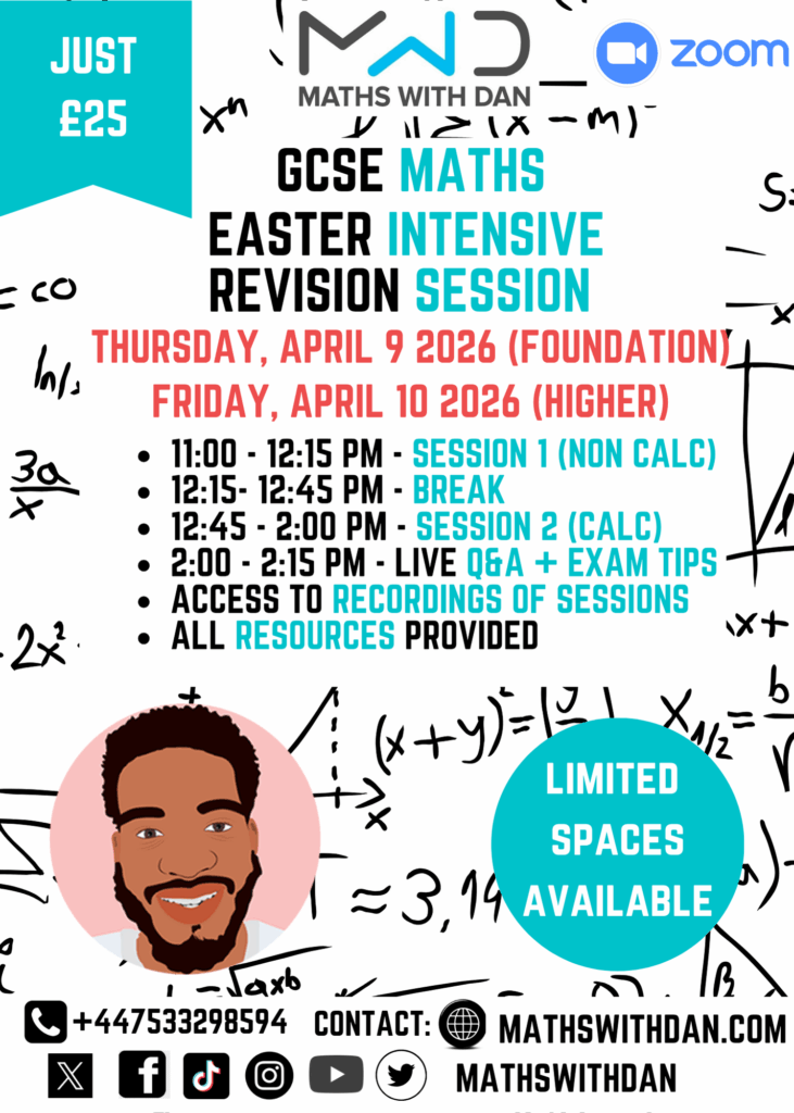 This revision session is designed for students who need a focused review of key GCSE topics before their final exams. Each session will cover commonly tested areas and essential exam techniques for both calculator and non-calculator papers.